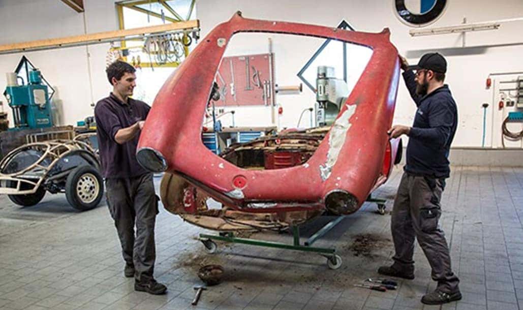 As was usual for projects of this nature, phase one was primarily destructive in nature. The vehicle was completely dismantled, a process which in this special case took an entire week, rather than the two days that had been originally planned. Initially, the aluminium body was separated from the floor assembly made of sheet steel. This was the only way of retaining as much of the original material as possible. The paint was then removed from the floor assembly in an acid bath and from the body in an alkaline bath. The engine had already been removed and the remnants of the interior that remained had been set aside.